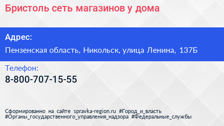 Бристоль, сеть магазинов у дома по адресу Пензенская область, Никольск, улица Ленина, 137Б в дальнейшем Организация, размещена в следующих категориях: