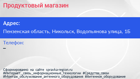 Продуктовый магазин по адресу Пензенская область, Никольск, Водопьянова улица, 1Б в дальнейшем Организация, размещена в следующих категориях: