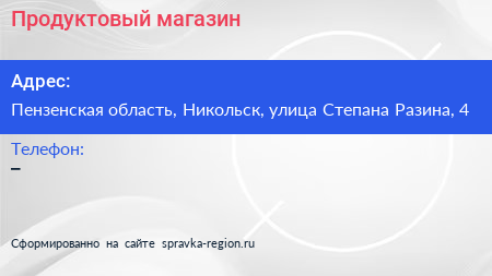 Продуктовый магазин по адресу Пензенская область, Никольск, улица Степана Разина, 4 в дальнейшем Организация, размещена в следующих категориях:
