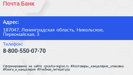 Почта Банк по адресу 187047, Ленинградская область, Никольское, Первомайская, 3 в дальнейшем Организация, размещена в следующих категориях: