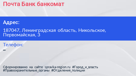 Почта Банк, банкомат по адресу 187047, Ленинградская область, Никольское, Первомайская, 3 в дальнейшем Организация, размещена в следующих категориях: