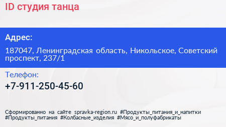 ID, студия танца по адресу 187047, Ленинградская область, Никольское, Советский проспект, 237/1 в дальнейшем Организация, размещена в следующих категориях: