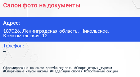 Салон фото на документы по адресу 187026, Ленинградская область, Никольское, Комсомольская, 12 в дальнейшем Организация, размещена в следующих категориях:
