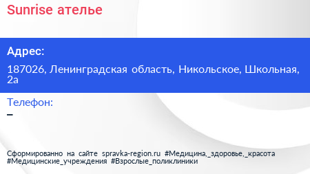 Sunrise, ателье по адресу 187026, Ленинградская область, Никольское, Школьная, 2а в дальнейшем Организация, размещена в следующих категориях: