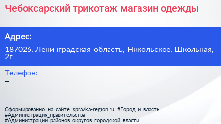 Чебоксарский трикотаж, магазин одежды по адресу 187026, Ленинградская область, Никольское, Школьная, 2г в дальнейшем Организация, размещена в следующих категориях: