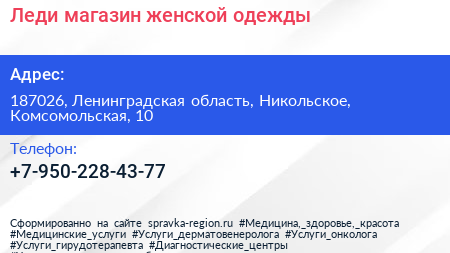 Леди, магазин женской одежды по адресу 187026, Ленинградская область, Никольское, Комсомольская, 10 в дальнейшем Организация, размещена в следующих категориях: