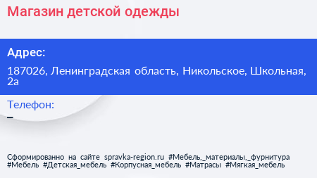 Магазин детской одежды по адресу 187026, Ленинградская область, Никольское, Школьная, 2а в дальнейшем Организация, размещена в следующих категориях: