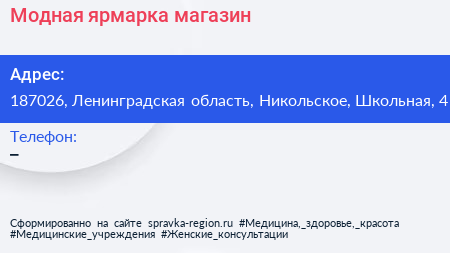 Модная ярмарка, магазин по адресу 187026, Ленинградская область, Никольское, Школьная, 4 в дальнейшем Организация, размещена в следующих категориях:
