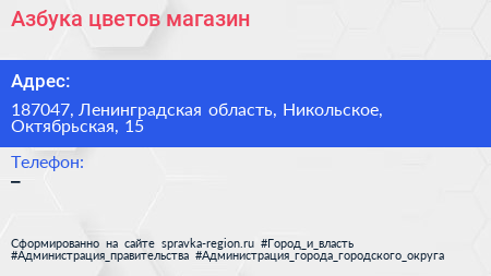 Азбука цветов, магазин по адресу 187047, Ленинградская область, Никольское, Октябрьская, 15 в дальнейшем Организация, размещена в следующих категориях: