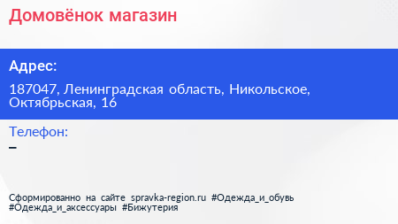 Домовёнок, магазин по адресу 187047, Ленинградская область, Никольское, Октябрьская, 16 в дальнейшем Организация, размещена в следующих категориях: