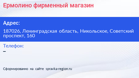 Ермолино, фирменный магазин по адресу 187026, Ленинградская область, Никольское, Советский проспект, 160 в дальнейшем Организация, размещена в следующих категориях: