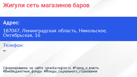 Жигули, сеть магазинов-баров по адресу 187047, Ленинградская область, Никольское, Октябрьская, 16 в дальнейшем Организация, размещена в следующих категориях: