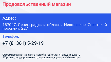 Продовольственный магазин по адресу 187047, Ленинградская область, Никольское, Советский проспект, 227 в дальнейшем Организация, размещена в следующих категориях: