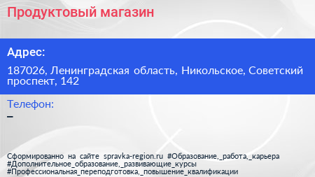 Продуктовый магазин по адресу 187026, Ленинградская область, Никольское, Советский проспект, 142 в дальнейшем Организация, размещена в следующих категориях: