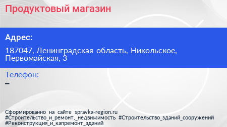 Продуктовый магазин по адресу 187047, Ленинградская область, Никольское, Первомайская, 3 в дальнейшем Организация, размещена в следующих категориях: