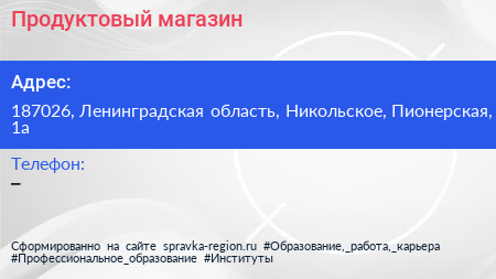 Продуктовый магазин по адресу 187026, Ленинградская область, Никольское, Пионерская, 1а в дальнейшем Организация, размещена в следующих категориях: