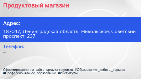 Продуктовый магазин по адресу 187047, Ленинградская область, Никольское, Советский проспект, 237 в дальнейшем Организация, размещена в следующих категориях: