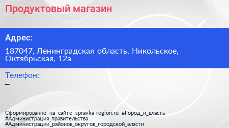 Продуктовый магазин по адресу 187047, Ленинградская область, Никольское, Октябрьская, 12а в дальнейшем Организация, размещена в следующих категориях:
