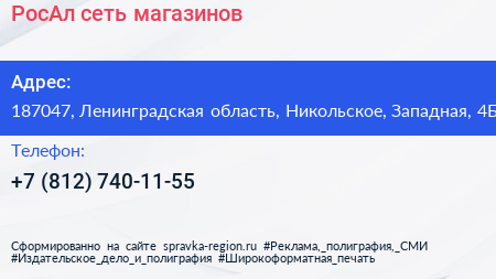 РосАл, сеть магазинов по адресу 187047, Ленинградская область, Никольское, Западная, 4Б в дальнейшем Организация, размещена в следующих категориях: