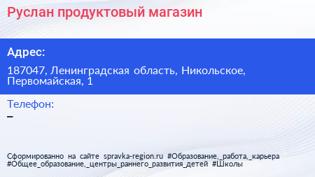 Руслан, продуктовый магазин по адресу 187047, Ленинградская область, Никольское, Первомайская, 1 в дальнейшем Организация, размещена в следующих категориях: