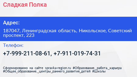 Сладкая Полка по адресу 187047, Ленинградская область, Никольское, Советский проспект, 223 в дальнейшем Организация, размещена в следующих категориях: