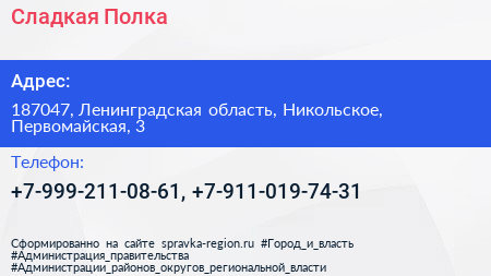 Сладкая Полка по адресу 187047, Ленинградская область, Никольское, Первомайская, 3 в дальнейшем Организация, размещена в следующих категориях: