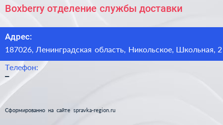 Boxberry, отделение службы доставки по адресу 187026, Ленинградская область, Никольское, Школьная, 2 в дальнейшем Организация, размещена в следующих категориях:
