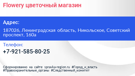 Flowery, цветочный магазин по адресу 187026, Ленинградская область, Никольское, Советский проспект, 160а в дальнейшем Организация, размещена в следующих категориях: