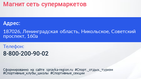 Магнит, сеть супермаркетов по адресу 187026, Ленинградская область, Никольское, Советский проспект, 160а в дальнейшем Организация, размещена в следующих категориях: