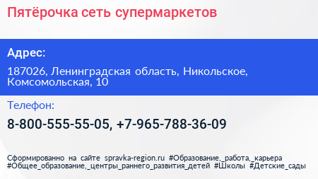 Пятёрочка, сеть супермаркетов по адресу 187026, Ленинградская область, Никольское, Комсомольская, 10 в дальнейшем Организация, размещена в следующих категориях: