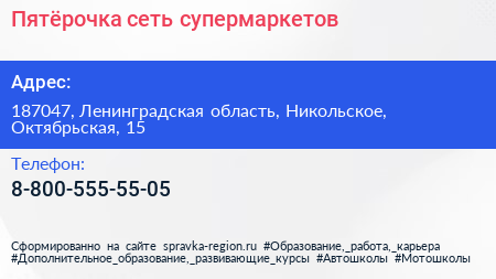Пятёрочка, сеть супермаркетов по адресу 187047, Ленинградская область, Никольское, Октябрьская, 15 в дальнейшем Организация, размещена в следующих категориях: