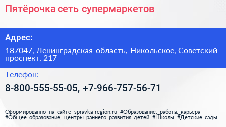 Пятёрочка, сеть супермаркетов по адресу 187047, Ленинградская область, Никольское, Советский проспект, 217 в дальнейшем Организация, размещена в следующих категориях: