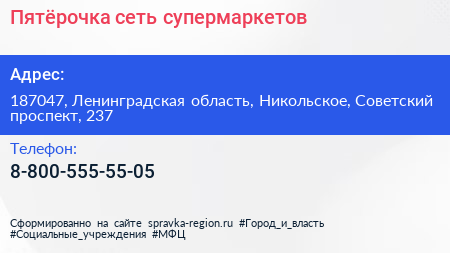 Пятёрочка, сеть супермаркетов по адресу 187047, Ленинградская область, Никольское, Советский проспект, 237 в дальнейшем Организация, размещена в следующих категориях: