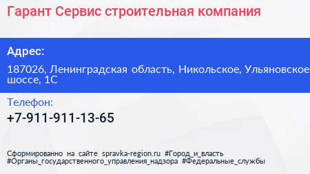 Гарант-Сервис, строительная компания по адресу 187026, Ленинградская область, Никольское, Ульяновское шоссе, 1С в дальнейшем Организация, размещена в следующих категориях: