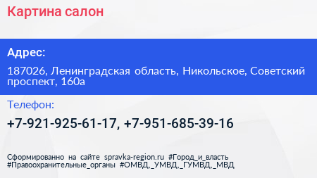 Картина, салон по адресу 187026, Ленинградская область, Никольское, Советский проспект, 160а в дальнейшем Организация, размещена в следующих категориях: