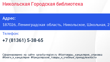 Никольская Городская библиотека по адресу 187026, Ленинградская область, Никольское, Школьная, 2 в дальнейшем Организация, размещена в следующих категориях: