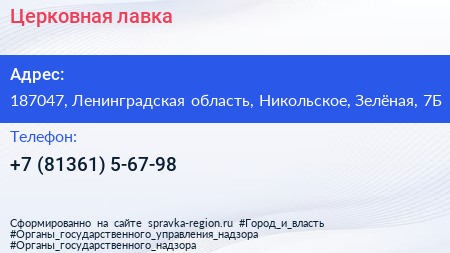 Церковная лавка по адресу 187047, Ленинградская область, Никольское, Зелёная, 7Б в дальнейшем Организация, размещена в следующих категориях: