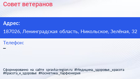 Совет ветеранов по адресу 187026, Ленинградская область, Никольское, Зелёная, 32 в дальнейшем Организация, размещена в следующих категориях: