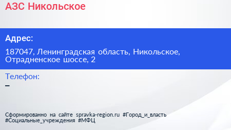 АЗС Никольское по адресу 187047, Ленинградская область, Никольское, Отрадненское шоссе, 2 в дальнейшем Организация, размещена в следующих категориях: