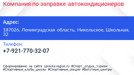 Компания по заправке автокондиционеров по адресу 187026, Ленинградская область, Никольское, Школьная, 32 в дальнейшем Организация, размещена в следующих категориях:
