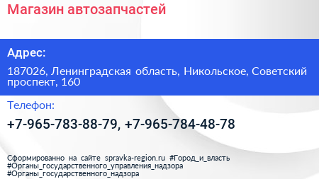 Магазин автозапчастей по адресу 187026, Ленинградская область, Никольское, Советский проспект, 160 в дальнейшем Организация, размещена в следующих категориях: