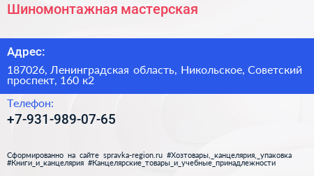 Шиномонтажная мастерская по адресу 187026, Ленинградская область, Никольское, Советский проспект, 160 к2 в дальнейшем Организация, размещена в следующих категориях: