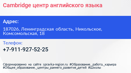 Cambridge, центр английского языка по адресу 187026, Ленинградская область, Никольское, Комсомольская, 18 в дальнейшем Организация, размещена в следующих категориях: