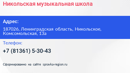 Никольская музыкальная школа по адресу 187026, Ленинградская область, Никольское, Комсомольская, 13а в дальнейшем Организация, размещена в следующих категориях: