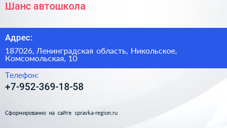 Шанс, автошкола по адресу 187026, Ленинградская область, Никольское, Комсомольская, 10 в дальнейшем Организация, размещена в следующих категориях: