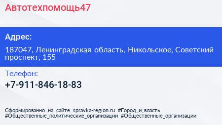 Автотехпомощь47 по адресу 187047, Ленинградская область, Никольское, Советский проспект, 155 в дальнейшем Организация, размещена в следующих категориях: