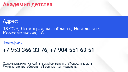 Академия детства по адресу 187026, Ленинградская область, Никольское, Комсомольская, 18 в дальнейшем Организация, размещена в следующих категориях: