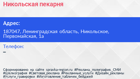 Никольская пекарня по адресу 187047, Ленинградская область, Никольское, Первомайская, 1а в дальнейшем Организация, размещена в следующих категориях: