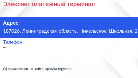 Элекснет, платежный терминал по адресу 187026, Ленинградская область, Никольское, Школьная, 2 в дальнейшем Организация, размещена в следующих категориях: