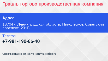 Грааль, торгово-производственная компания по адресу 187047, Ленинградская область, Никольское, Советский проспект, 231Б в дальнейшем Организация, размещена в следующих категориях: